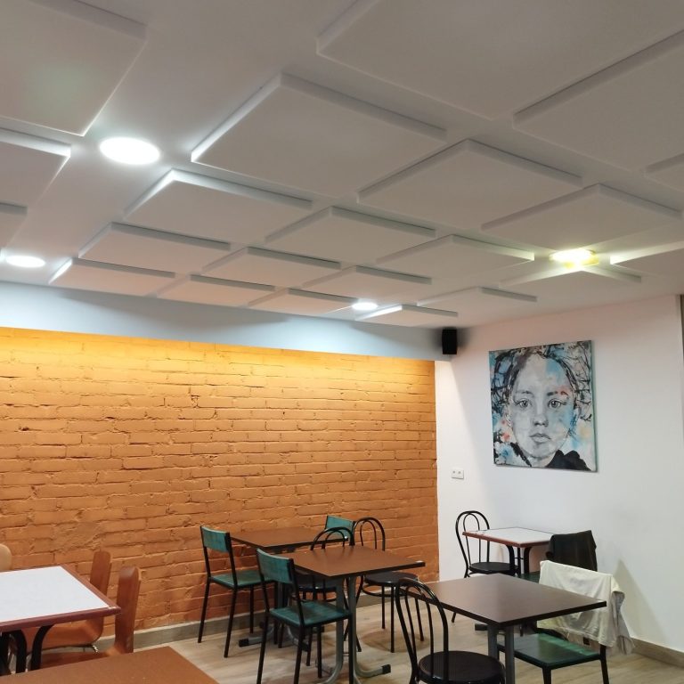 Suministro y colocación de placas fonoabsorbentes para mejorar el confort acústico en un restaurante en Barcelona.
