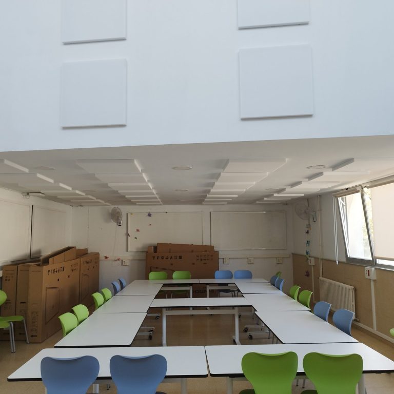 Intstalación de placas fonoabsorbentes Soniair, para evitar el eco en un aula de un colegio en Molins de Rei.