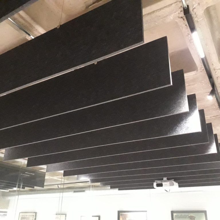 Bafles fonoabsorbentes situados en el techo de unas oficnas, de una gestoria, en Barcelona .