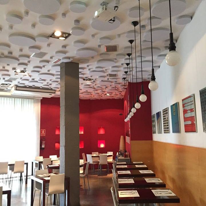 Suministro y colocación de placas fonoabsorbentes para mejorar el confort acústico en un restaurante en Barcelona.