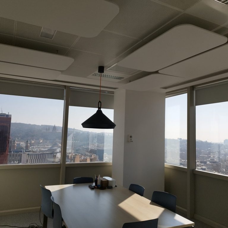 Placas fonoabsorbentes instalada mediante imanes en unas oficina, en Barcelona. Este sistema de montaje, para techo metálico, permite mover las placas cuando sea necesario.